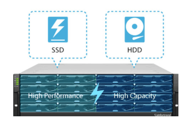 Infortrend DS permite configuraciones con discos SAS y SATA, tanto SSD como HDD, para ofrecer un equilibrio entre capacidad, coste y rendimiento. Además, permiten también el uso de SSD NVMe en formato U.2, con lo que se consigue un rendimiento considerablemente superior para entornos críticos o de gran carga de I/O.