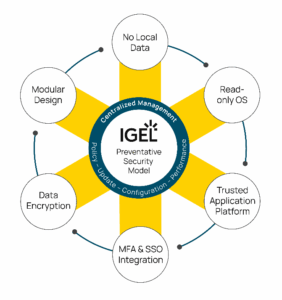 Implementa una estrategia de seguridad preventiva en los endpoints, reduciendo un 95% la superficie de ataque con IGEL OS, un sistema sólo de lectura que integra funciones que garantizan un acceso seguro a tu infraestructura.