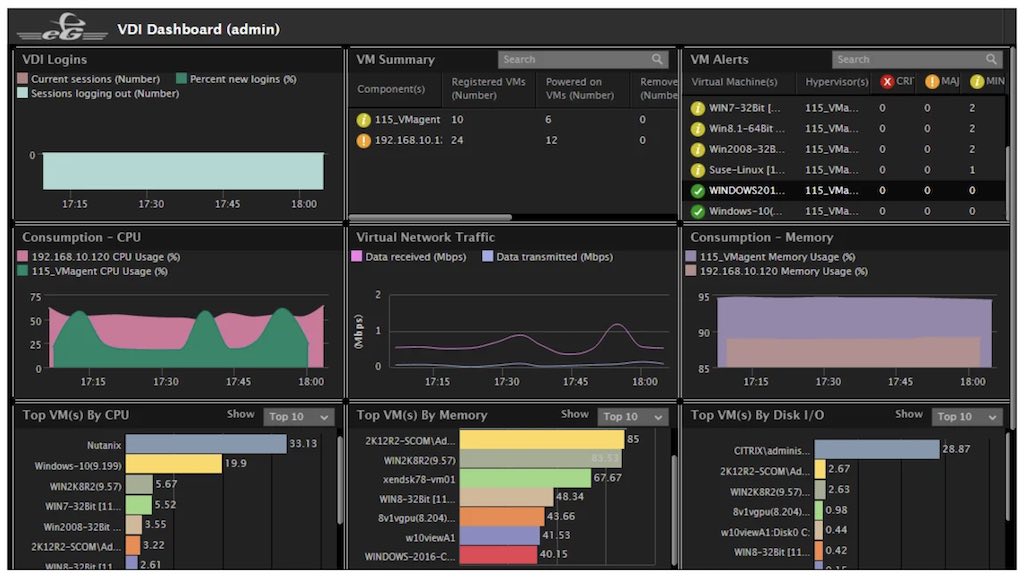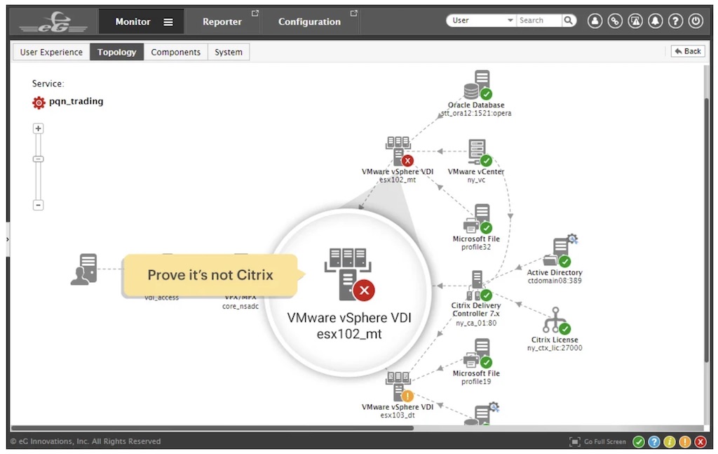 Más allá de VMware vROps, eG Enterprise es una solución de monitorización integral que proporciona monitorización del rendimiento interno y externo para escritorios virtuales con tecnología Omnissa Horizon. En pocos minutos, puedes resolver problemas de inicio de sesión lentos, de acceso a aplicaciones lento, y de capacidad de VDI, consiguiendo optimizar la experiencia digital de los usuarios.